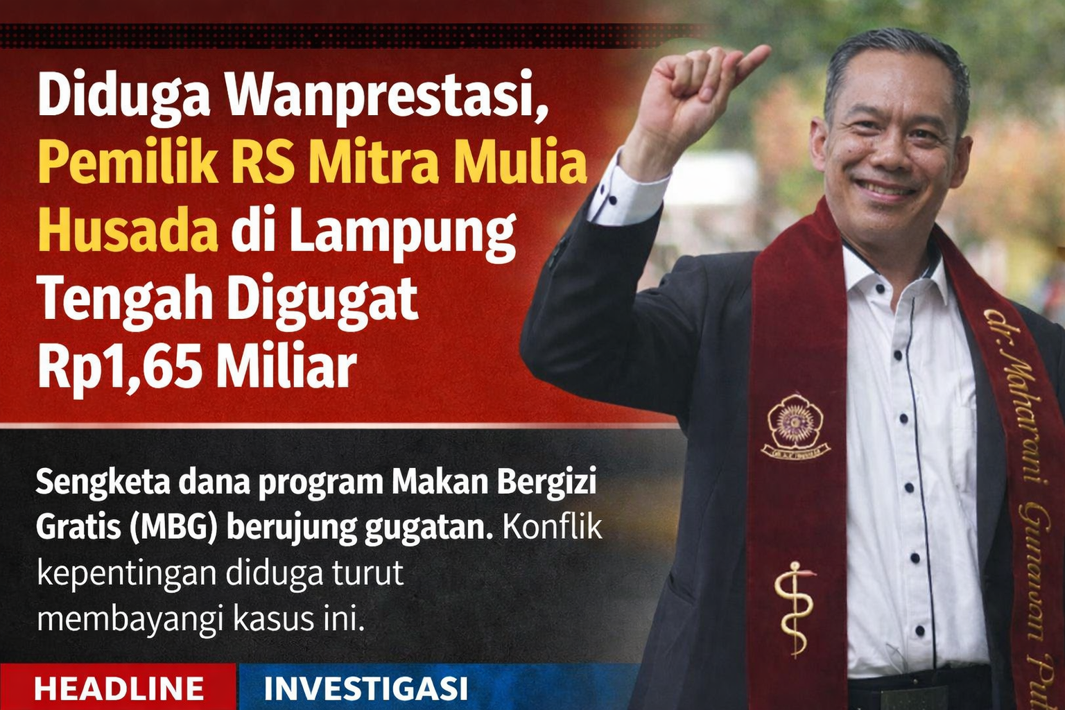 LAMTENG, SUARA KITA — Kantor hukum Gunawan Raka & Partners secara resmi mengajukan gugatan perdata terhadap pemilik Rumah Sakit Mitra Mulia Husada, Lampung Tengah, dr. Uswatun Hasanah, bersama Heri Utomo sebagai tergugat II dan Doni Ferdinan sebagai turut tergugat, ke Pengadilan Negeri Gunungsugih pada 7 April 2026.