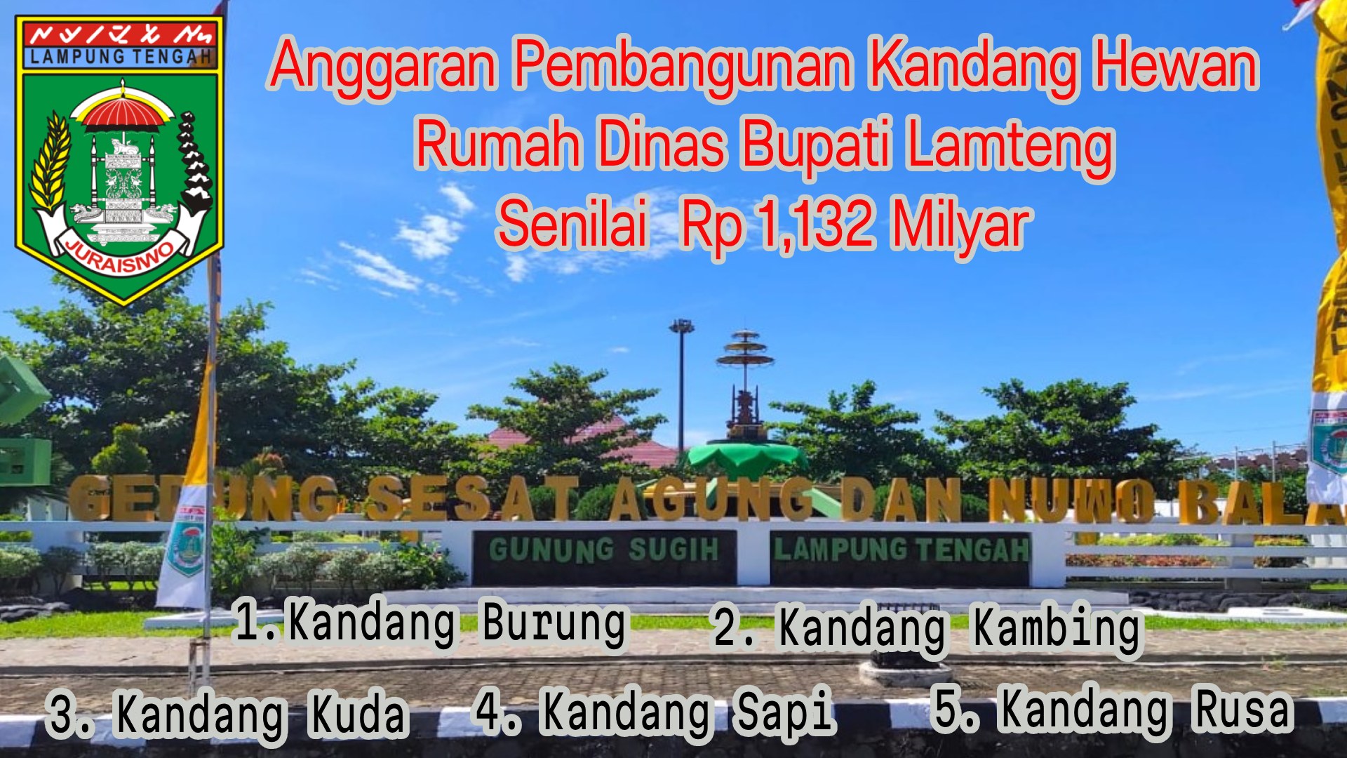 Pembangunan Kandang Hewan Rumah Dinas Bupati Lampung Tengah senilai Rp1,132 Milyar sangat melukai masyarakat Lamteng. Belum hilang ingatan masyarakat dengan Langkah Bupati Lamteng Ardito Wijaya berhutang ke PT Sarana Multi Infrastruktur senilai Rp 110,48 miliar guna memperbaiki empat ruas jalan.