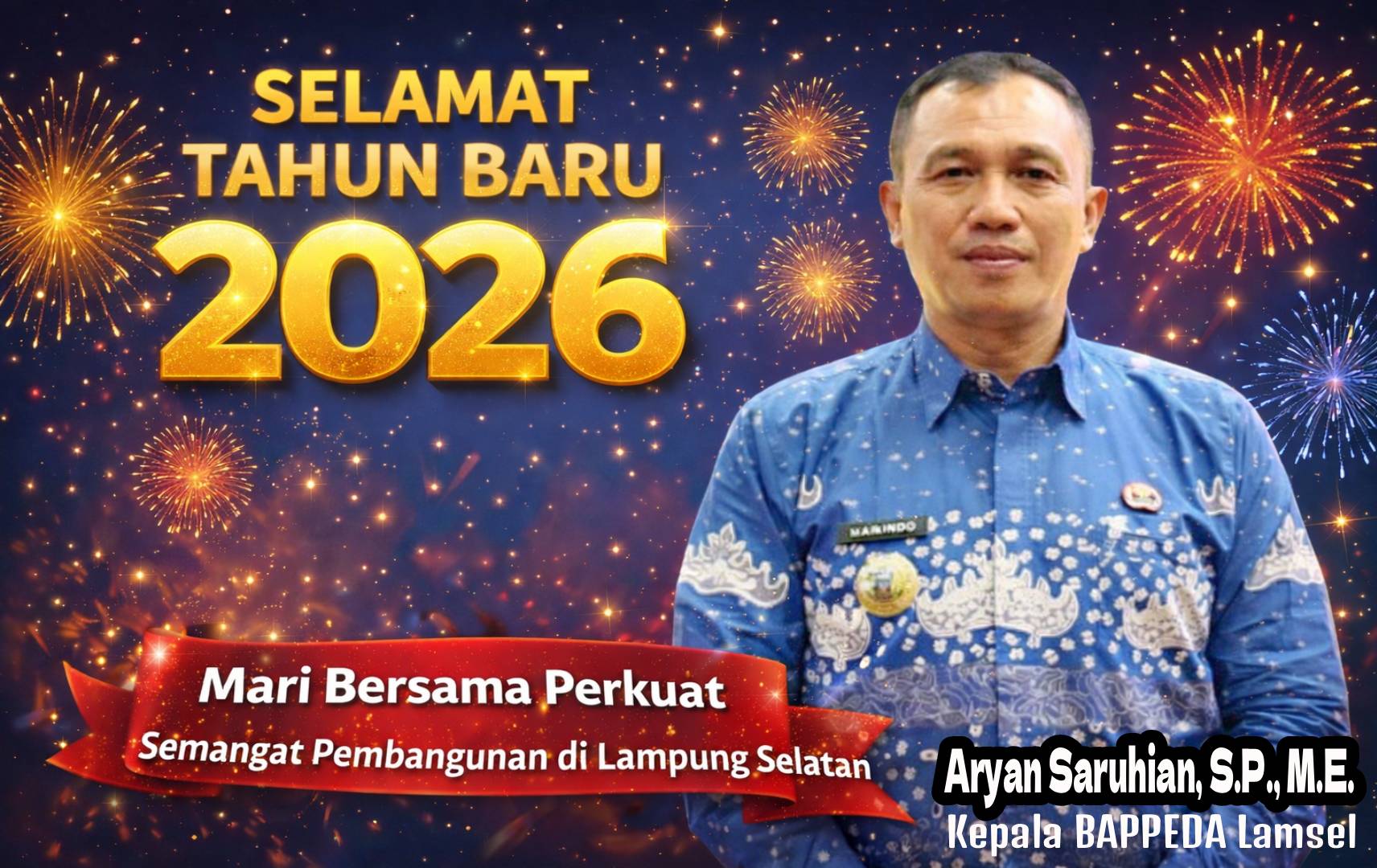 Lampung Selatan, Suara Kita – Menyambut pergantian tahun, Kepala Badan Perencanaan Pembangunan Daerah (BAPPEDA) Kabupaten Lampung Selatan, Ir. Aryan Saruhian, S.P., M.E, menyampaikan ucapan selamat Tahun Baru 2026 kepada seluruh masyarakat Lampung Selatan.