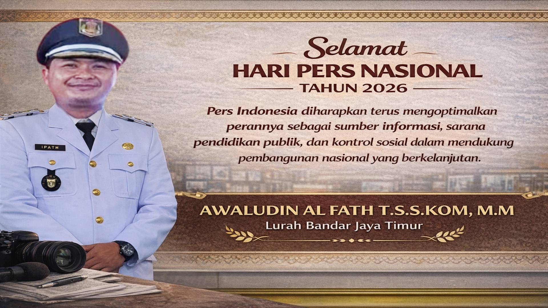 LAMTENG, suara kita — Dalam rangka memperingati Hari Pers Nasional (HPN) Tahun 2026, Lurah Bandar Jaya Timur, Awaludin Al Fath, T.S.S.Kom, M.M, menyampaikan apresiasi dan penghargaan kepada seluruh insan pers Indonesia atas peran strategisnya dalam menjaga kualitas informasi dan demokrasi.