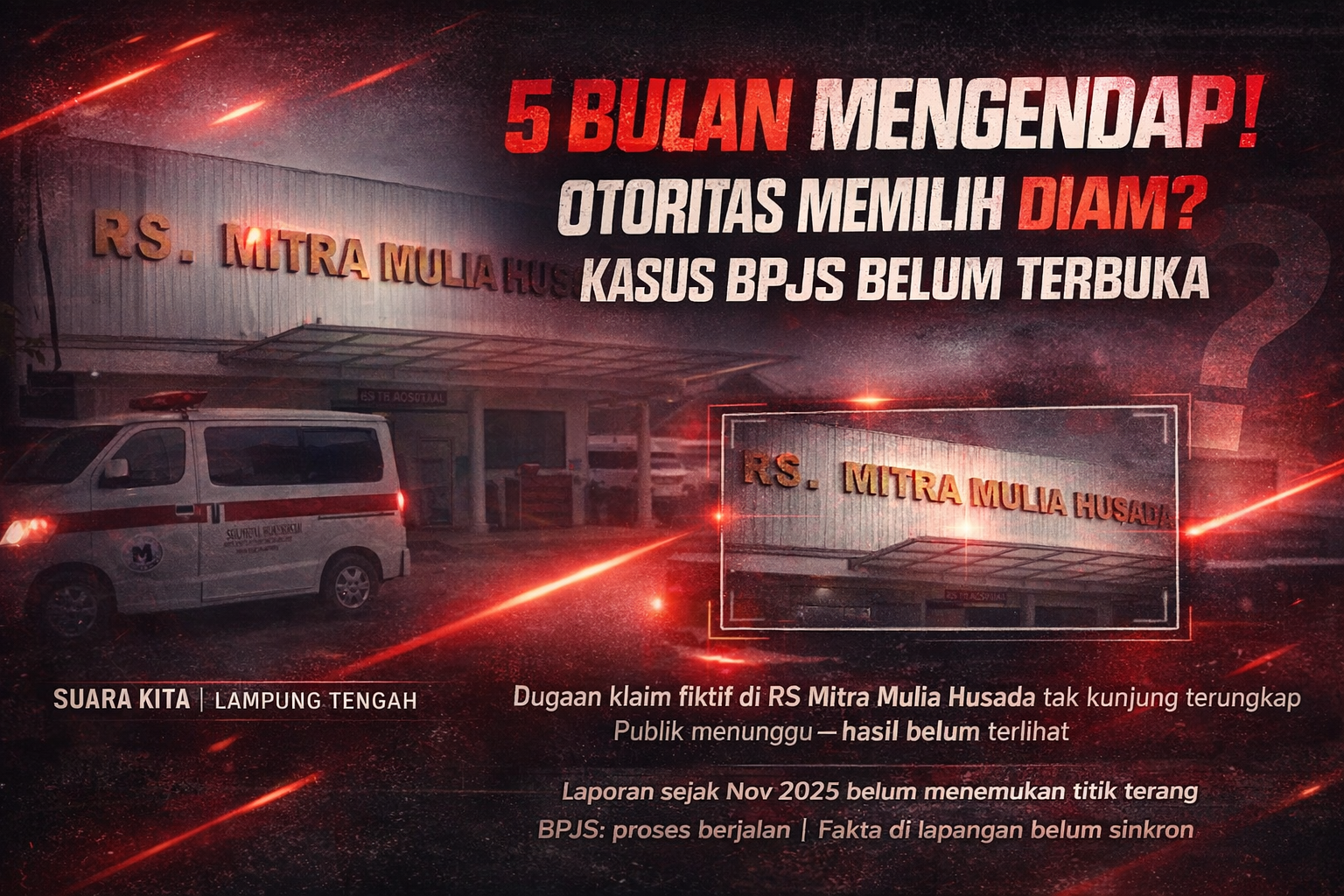 Lamteng, Suara Kita — Aroma dugaan praktik tak sehat dalam layanan kesehatan kembali mencuat. Laporan terkait dugaan fee rujukan dan manipulasi klaim BPJS fiktif di Rumah Sakit Mitra Mulia Husada (RS MMH), Bandarjaya, Lampung Tengah, disebut tak kunjung menemukan titik terang—meski telah bergulir selama lima bulan.
